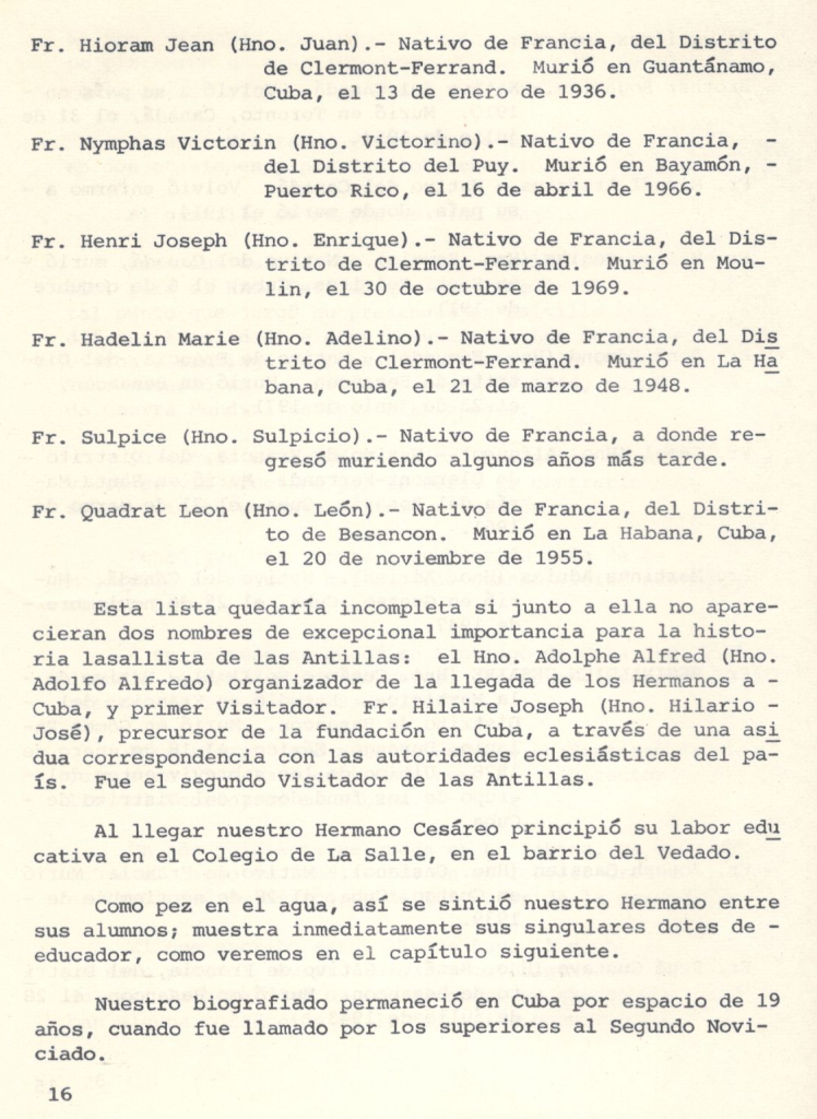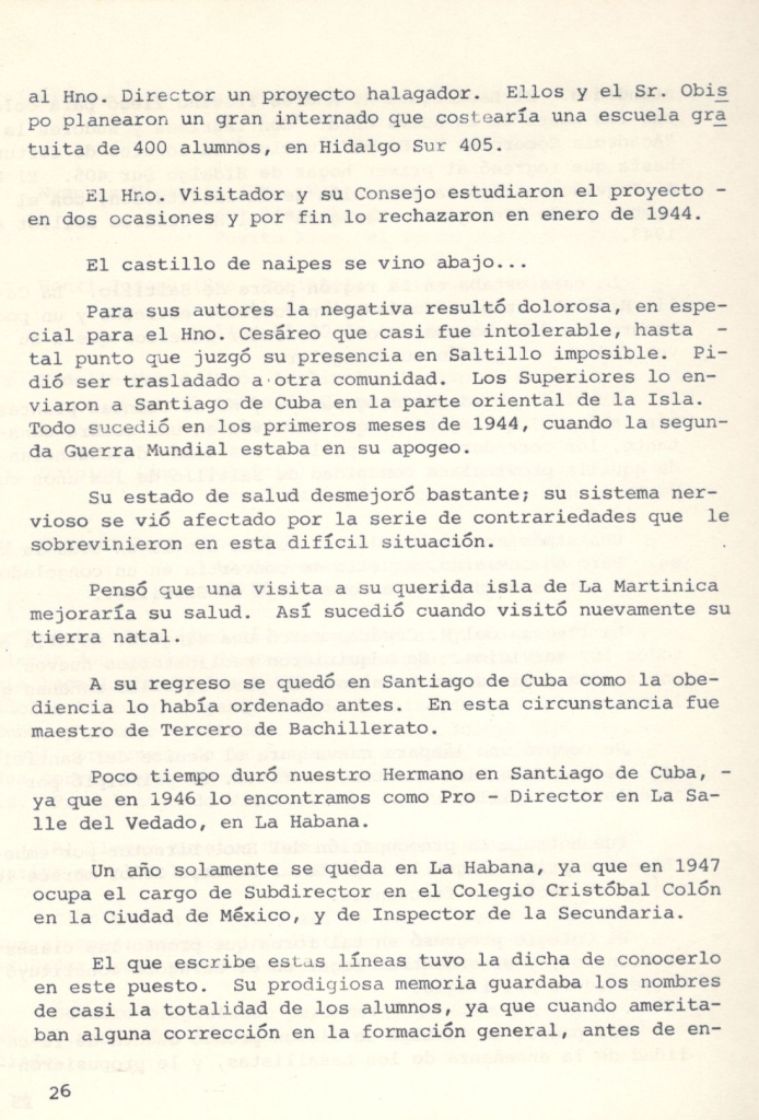 Poco tiempo duró El Hno. Cesáreo en Santiago de Cuba, ya que en 1946 lo encontramos como ProDirector en La Selle del Vedado, en La Habana.