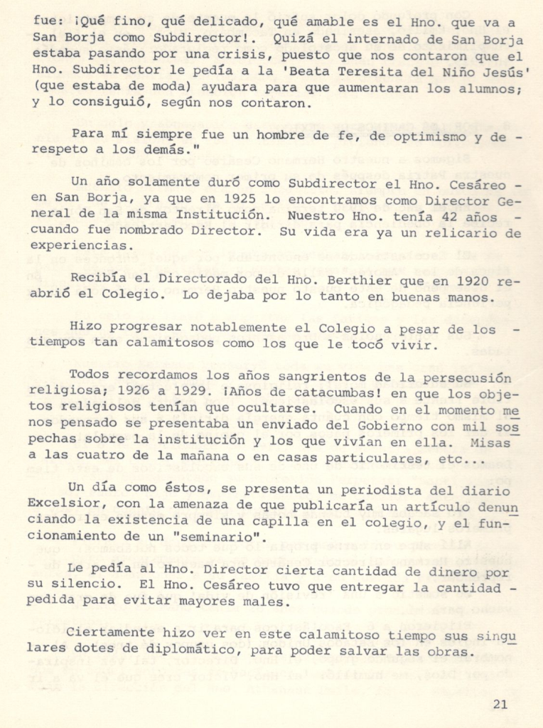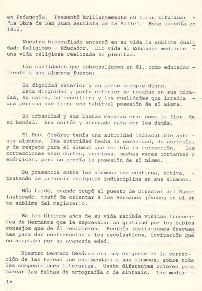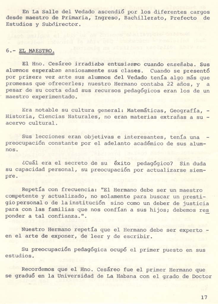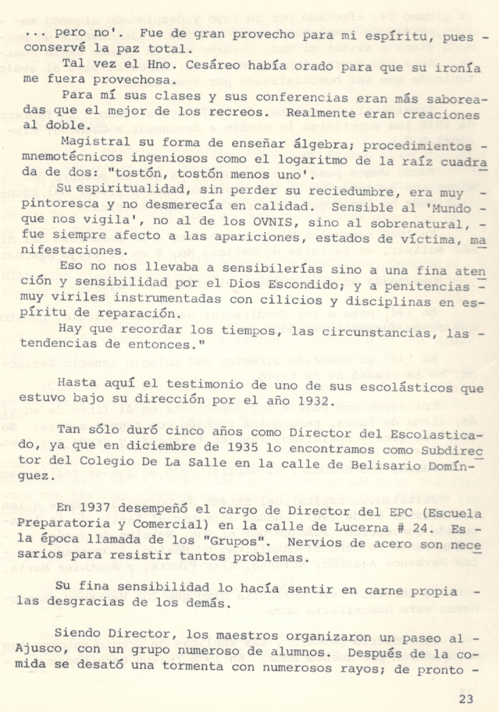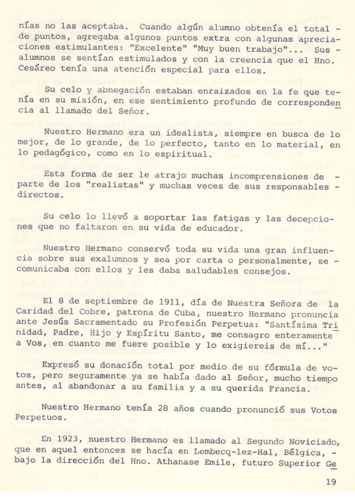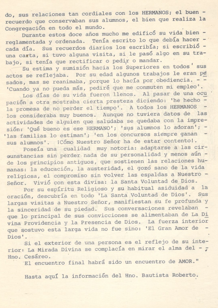 «Viví con él, tuve el gusto de vivir con el Carísimo Hno. Cesáreo durante 12 años. Muy notable y admirable ‘su sociabilidad’. A todos acogía con gran simpatía. Más entusiasmo mostraba cuando eran alumnos o antiguos alumnos. En su conversación se notaba que hablaba como si fueran conocidos de largo tiempo. Casi siempre sus conversaciones eran acerca de su larga vida de Religión. La vida en común que había lleva do, sus relaciones tan cordiales con los HERMANOS; el buen recuerdo que conservaban sus alumnos, el bien que realiza la Congregación en todo el mundo. Durante estos doce años mucho me edificó su vida bien reglamentada y ordenada. Tenía escrito lo que debía hacer cada día. Sus recuerdos diarios los escribía; si escribió una carta, si tuvo alguna visita, si le pasó algo en su trabajo, si tenía que rectificar o pedir o mandar. Su estima y sumisión hacia los Superiores en todos sus actos se reflejaba. Por su edad algunos trabajos le eran pesados, más se reanimaba, porque lo hacía por obediencia. ‘Cuando ya no pueda más, pediré que me conmuten mi empleo’. Los días de su vida fueron llenos. Al pasar de una ocupación a otra mostraba cierta presteza diciendo: ‘he hecho la promesa de no perder el tiempo’. A todos los HERMANOS los consideraba muy buenos. Aunque no tuviera datos de las actividades de alguien que saludaba se quedaba con la impresión: ‘Qué bueno es ese HERMANO’; ‘sus alumnos lo adoran’; ‘las familias lo estiman’; ‘en los concursos siempre ganan sus alumnos’. ¡Cómo Nuestro Señor ha de estar contento! Poseía una cualidad muy notoria: adaptarse a las circunstancias sin perder nada de su personalidad y menos aún de los principios antiguos, que sostienen las relaciones humanas: la educación, la austeridad, el gozó sano de la vida religiosa, el compromiso sin Volver las espaldas a Nuestro Señor. Vivió con esta divisa: la Santa Voluntad de Dios. Por su espíritu religioso y su habitual asiduidad a la oración, descubría en todo ‘La Santa Voluntad de Dios’. Sus largas visitas a Nuestro Señor manifiestan su fe profunda y la sinceridad de su piedad. Sus conversaciones revelaban que lo principal de sus convicciones se alimentaban de La Di vina Providencia y la Presencia de Dios. La fuerza interior que sostuvo esta larga vida no fue sino: ‘El Gran Amor de Dios’. Si el exterior de una persona es el reflejo de su interior, La Mirada Divina se complacía en mirar el alma del Hno. Cesáreo. El encuentro final habrá sido un encuentro de AMOR.»
