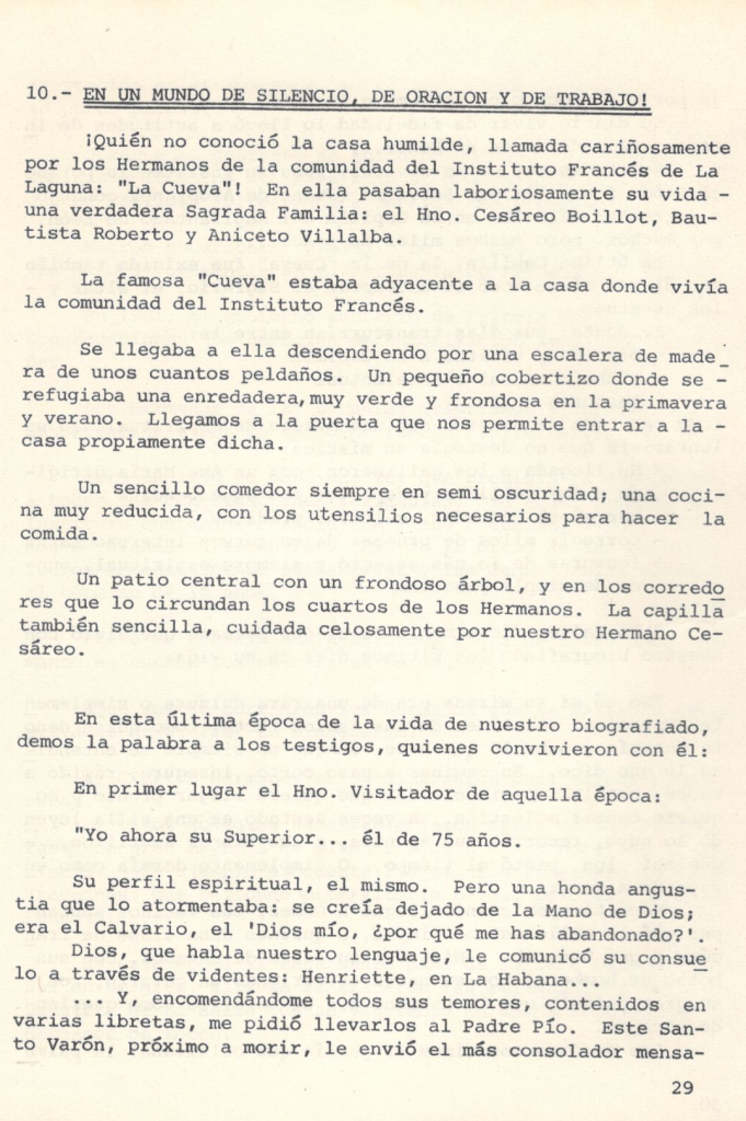 Hablar de la vida espiritual del Hno. Cesáreo, es adentrarse en un mundo de comunicaciones íntimas con Dios, como las que se realizan en la vida de un gran místico.