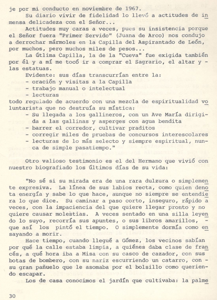 Actitudes muy caras a veces, pues su insistencia porque el Señor fuera «Primer Servido» (Juana de Arco) nos condujo a derrochar mármoles en la Capilla del Aspirantado de León, por muchos, pero muchos miles de pesos… La Calima Capilla, la de la «Cueva» fue exigida también por él y a mí me tocó ir a comprar el Sagrario, el altar y las estatuas.