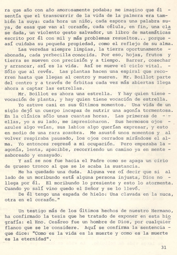 Un testigo más de los últimos hechos del Hno. Cesáreo ha confirmado la tesis que he tratado de exponer en esta bio grafía: el Hno. Cesáreo fue un hombre de Dios, por cualquier flanco que se le considere. Aquí se confirma la sentencia que dice: «Como es la vida es la muerte y como es la muerte es la eternidad».