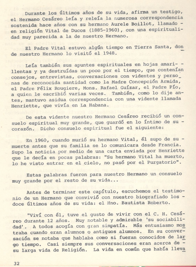 Durante los últimos años de su vida, afirma un testigo, el Hermano Cesáreo leía y releía la numerosa correspondencia sostenida hace años con su hermano Aurele Boillot, llamado en religión Vital de Ducos (18851960), con una espiritualidad muy parecida a la de del Hno. Cesáreo.