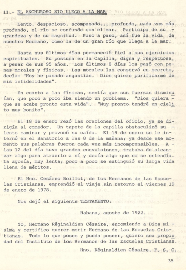 Yo, Hermano Réginaldien Césaire, encomiendo a Dios mi alma y certifico querer morir Hermano de las Escuelas Cristianas. Todo lo que poseo y pueda poseer, quiero sea propiedad del Instituto de los Hermanos de las Escuelas Cristianas.