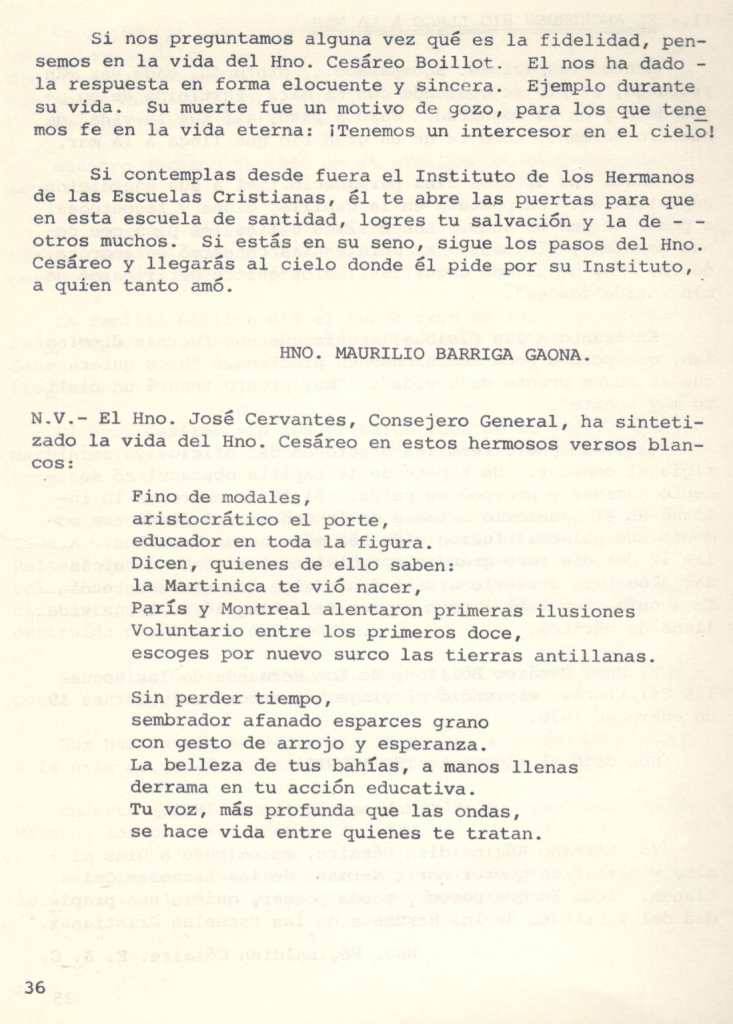 Si contemplas desde fuera el Instituto de los Hermanos de las Escuelas Cristianas, él te abre las puertas para que en esta escuela de santidad, logres tu salvación y la de otros muchos. Si estás en su seno, sigue los pasos del Hno. Cesáreo y llegarás al cielo donde él pide por su Instituto, a quien tanto amó.