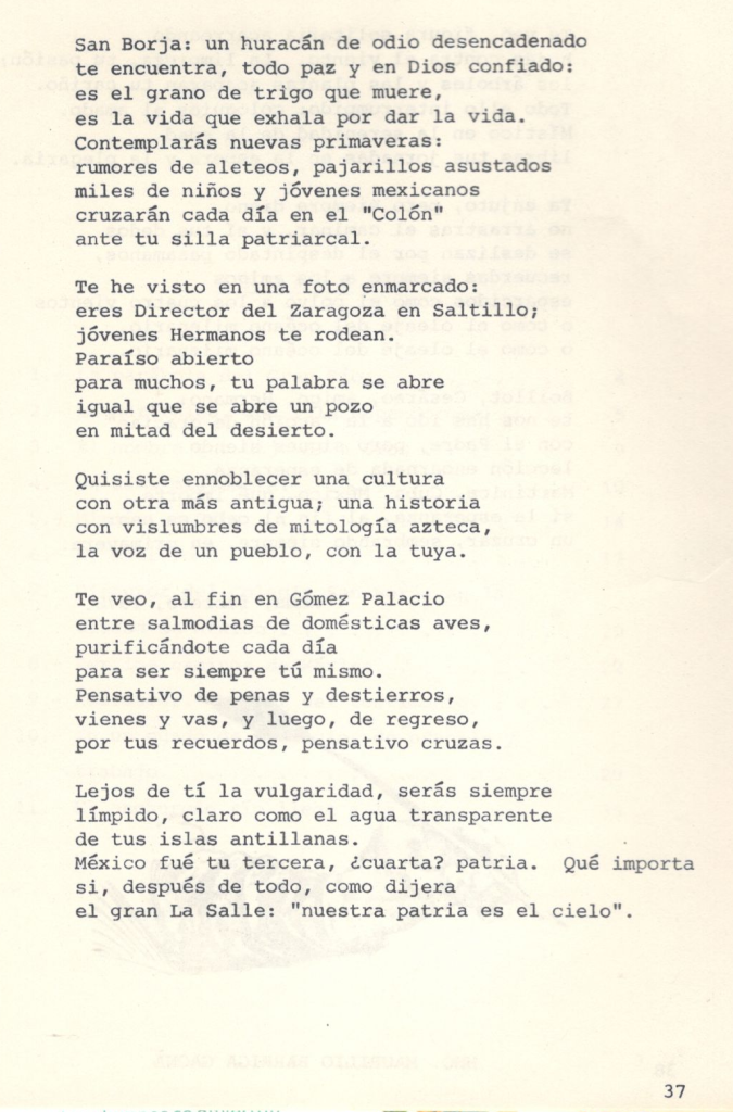 San Borja: un huracán de odio desencadenado te encuentra, toda paz y en Dios confiado: es el grano de trigo que muere, es la vida que exhala por dar la vida. Contemplarás nuevas primaveras: rumores de aleteos, pajarillos asustados miles de niños y jóvenes mexicanos cruzarán cada día en el «Colón» ante tu silla patriarcal.