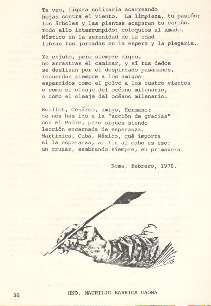 Boillot, Cesáreo, amigo, Hermano: te nos has ido a la «acción de gracias» con el Padre, pero sigues siendo lección encarnada de esperanza. Martinica, Cuba, México, qué importa si la esperanza, al fin al cabo es eso: un cruzar, sembrando siempre, en primavera.