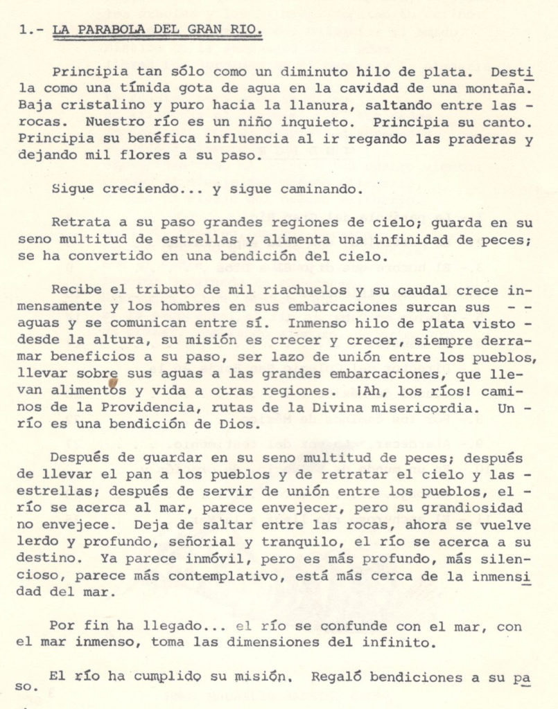 Recibe el tributo de mil riachuelos y su caudal crece inmensamente y los hombres en sus embarcaciones surcan sus aguas y se comunican entre si. Inmenso hilo de plata visto desde la altura, su misión es crecer y crecer, siempre derramar beneficios a su paso, ser Lazo de unión entre los pueblos, llevar sobre sus aguas a las grandes embarcaciones, que llevan alimentos y vida a otras regiones. ¡Ah, los ríos! caminos de la Providencia, rutas de la Divina misericordia. Un río es una bendición de Dios.