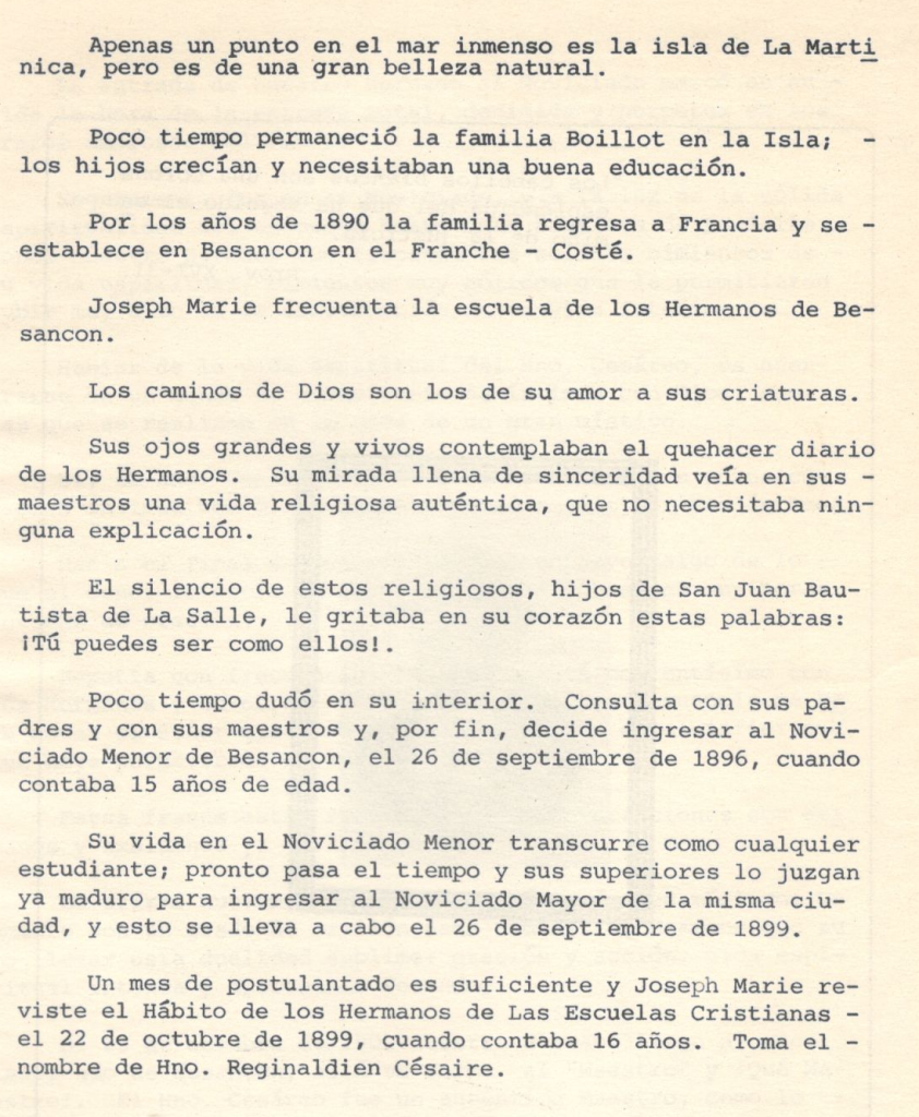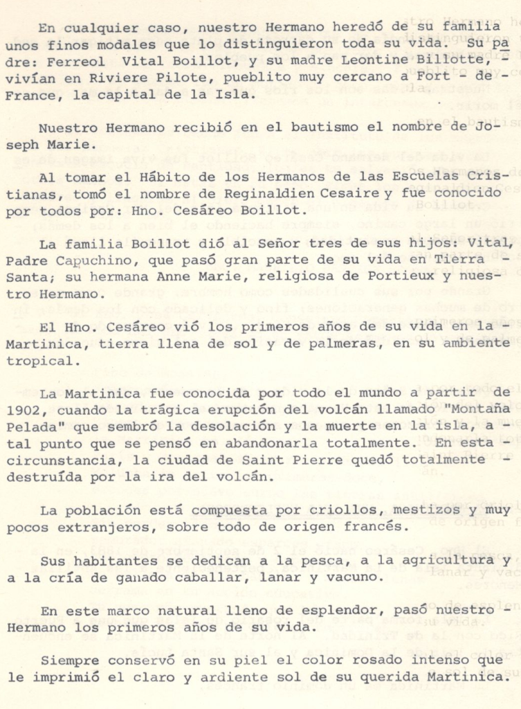 En cualquier caso, El Hno. Cesáreo heredó de su familia unos finos modales que lo distinguieron toda su vida. Su padre: Ferreol Vital Boillot, y su madre Leontine Billotte, vivían en Rivière Pilote, pueblito muy cercano a Fort de France, la capital de la Isla.