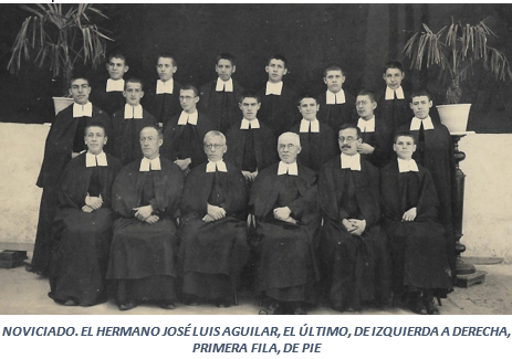 El Hermano José Luis Aguilar Escobedo llegó al Noviciado, procedente del Noviciado Menor, el 22 de octubre de 1933; fueron un grupo de siete postulantes, entre los que se encontraban los futuros Hermanos: Ernesto Pizarro, José Sánchez Espinosa, Ricardo Cortés, Alfonso Aguilar y el Hermano José Luis Aguilar Escobedo. Su toma de Hábito fue el 24 de diciembre de 1933, en la finca de los Amores y su director fue el sabio Hermano Benildo Justino, apoyándolo como subdirector el Hermano Barnabé Marie. Inició su Noviciado en la finca de los Amores, de ahí tiene que pasar a Tlalpan, en la calle de Allende 2, de ahí pasan a otra casa en Londres 247, llamada la casa Azul, para terminar en Tacubaya. Fueron tiempos difíciles donde las denuncias abundaban y había que vivir como en tiempos de las catacumbas.