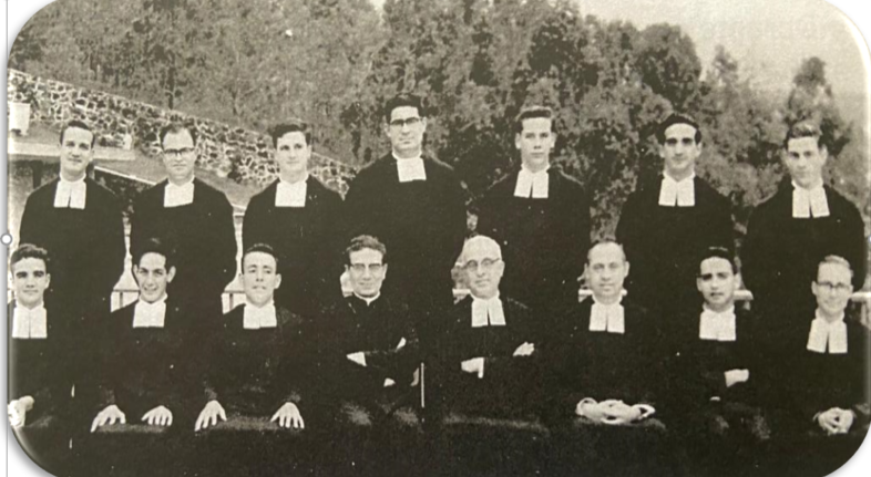 Atrás, de pie, de derecha a izquierda, el 4to. el Hno. Juan Estudillo y el Hno. Francisco Barba, atrás se encuentran los Hnos. Ambrosio Luna, Héctor García Zaragoza, Teodoro Luis, y en la última fila Ramiro Montaño, Lucio Tazzer, Germán Martínez, y Pedro Vela.
