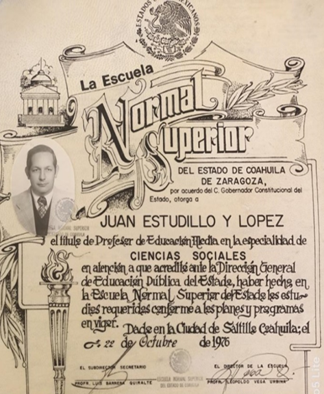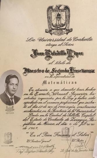 Posdata: Dos diplomas de la Universidad de Coahuila otorgados al Hno. Juan que lo acreditan como Maestro de Educación Superior en las especialidades de Matematicas y de Ciencias Sociales.