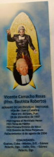 Este cristiano hogar dará al Instituto dos de sus hijos: el Hermano Bautista Lorenzo, Lorenzo Camacho + en 1920 y el Hermano Bautista Roberto, Vicente. (El nació en 1897. Ingresó al Instituto en 1917 a la edad de 20 años y fue alumno de los Hermanos en Acatzingo.,m Pue. Fue formado para la primera Toma de Hábito al renavcer el Noviciado de San Borja, en ese mismo año. Antes de entrar había trabajado con los Padres Escolapios en su escuela en Puebla y en 1920 era maestro de los Chiquito de Mixcoac. Murió en San Borja, de fiebre española, siendo uno de los prieross Hermano mexicanos fallecidos.)